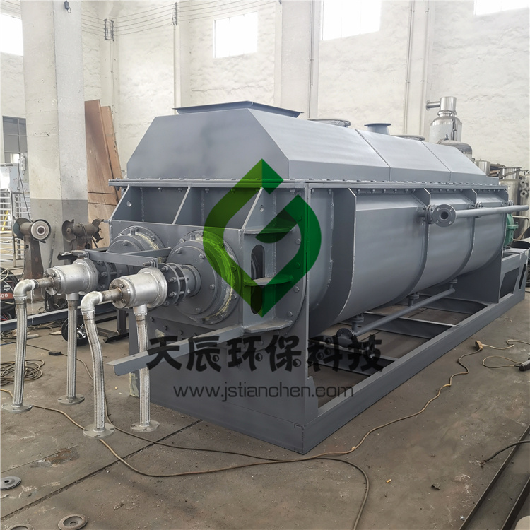 (2)热源产生。可使用热蒸汽或热油作为热交换的热源。一般热流体的温度为180℃-200℃。热介质分别被引入中空的干燥机壳体和转动的轴桨叶等所有与污泥接触进行热交换的加热金属表面。